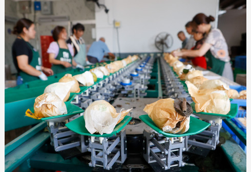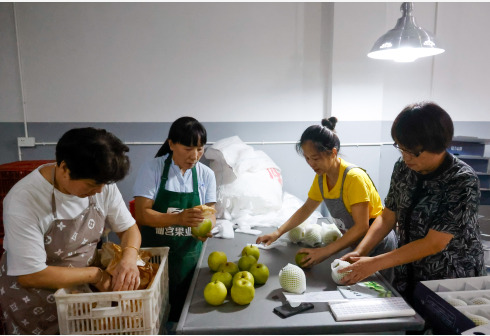 7月17日,工人在云和县安溪畲族乡木犀花村雪梨基地包装车间包装雪梨。