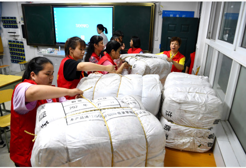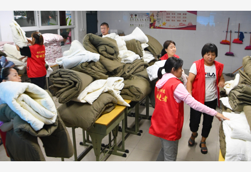 7月21日,在郑州市电子信息工程学校集中安置点,志愿者在整理被褥。近日,受强降雨影响,河南省郑州市常庄水库水位持续上升。为保障水库周边居民生命财产安全,郑州市中原区组织人员紧急转移常庄水库周边居民230人。记者在郑州市电子信息工程学校集中安置点看到,转移群众食宿有保障,安置状况良好。 新华社记者 郝源 摄