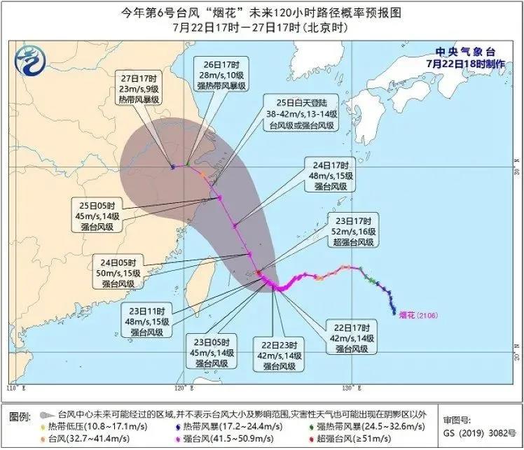 中央气象台预计,台风“烟花”将以每小时5~10公里的速度向西偏北方向移动,23日傍晚前后移入东海东南部海面,并将于25日白天在浙江北部到福建北部一带沿海登陆;目前尚不能完全排除在浙江近海海面北上的可能。