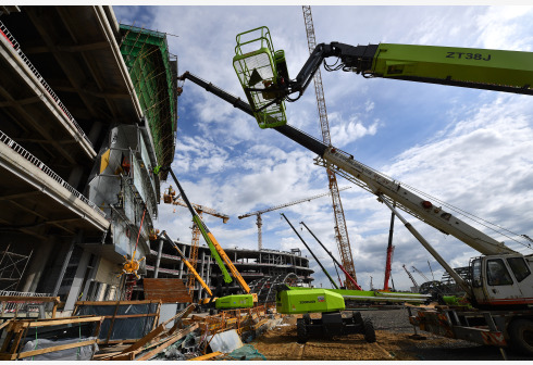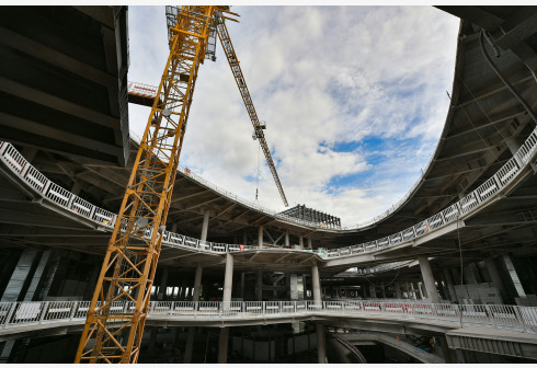 这是免税商业中心内部施工现场(7月28日摄)。近日,海口国际免税城免税商业中心主体结构施工完毕,目前在进行玻璃幕墙及屋面网架结构样板施工。海口国际免税城项目总建筑面积约92.6万平方米,预计2022年正式营业。 新华社记者 郭程 摄