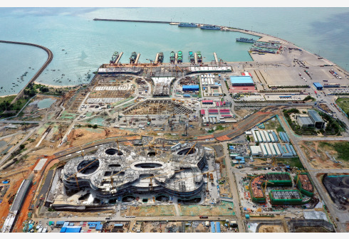 7月28日拍摄的海口国际免税城项目施工现场(无人机照片)。近日,海口国际免税城免税商业中心主体结构施工完毕,目前在进行玻璃幕墙及屋面网架结构样板施工。海口国际免税城项目总建筑面积约92.6万平方米,预计2022年正式营业。 新华社记者 郭程 摄