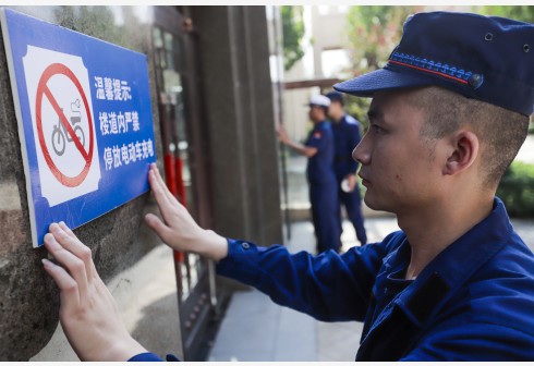 8月1日,消防救援人员在河北省遵化市一住宅小区楼道门口张贴禁放电动车标识。8月1日起,《高层民用建筑消防安全管理规定》开始施行,对电动车“进楼”问题作出规定。规定明确,禁止在高层民用建筑公共门厅、疏散走道、楼梯间、安全出口停放电动自行车或者为电动自行车充电。鼓励在高层住宅小区内设置电动自行车集中存放和充电的场所。 新华社 发(刘满仓 摄)
