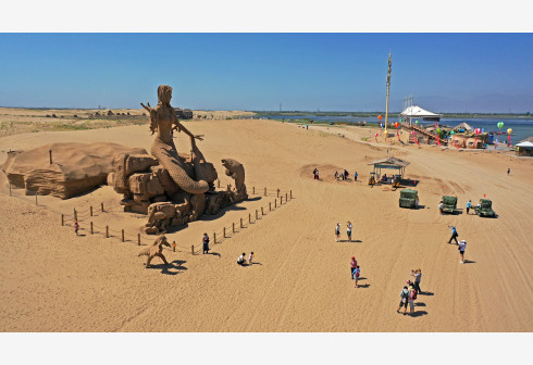 这是7月31日拍摄的宁夏沙湖景区内的巨型沙雕景观(无人机照片)。夏日时节,地处宁夏石嘴山市平罗县的沙湖景区内,苇绿沙黄、碧波荡漾。集荒漠、草原、湿地、湖泊等生态系统为一体的沙湖景区,享有“中国十大魅力湿地”称号,以其半沙半湖的独特自然风光享誉国内外。新华社记者 王鹏 摄