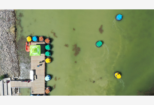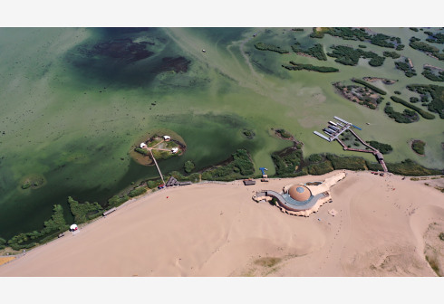 这是7月31日拍摄的宁夏沙湖景区(无人机照片)。夏日时节,地处宁夏石嘴山市平罗县的沙湖景区内,苇绿沙黄、碧波荡漾。集荒漠、草原、湿地、湖泊等生态系统为一体的沙湖景区,享有“中国十大魅力湿地”称号,以其半沙半湖的独特自然风光享誉国内外。 新华社记者 王鹏 摄