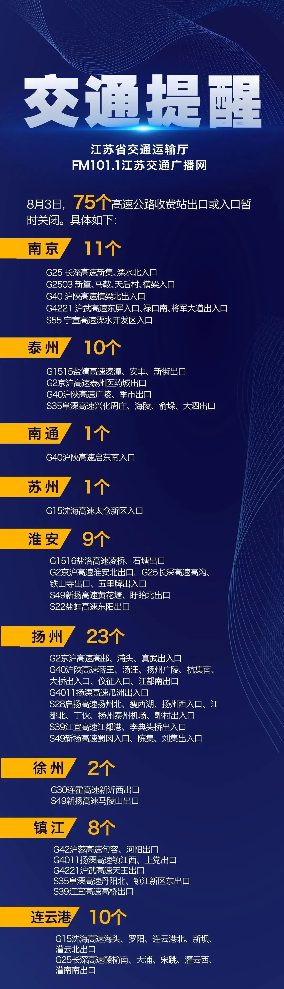全省75个高速公路收费站出口或入口暂时关闭,双向管制31处普通国省道