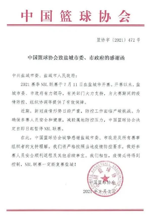近期,新冠疫情形势日趋严重,为确保参赛人员安全和健康,中国篮球协会决定自即日起暂停NBL联赛。在此,中国篮球协会诚挚感谢盐城市委、市政府及所有赛事组织者的支持理解,同时感谢赛事参与者和球迷的支持理解。