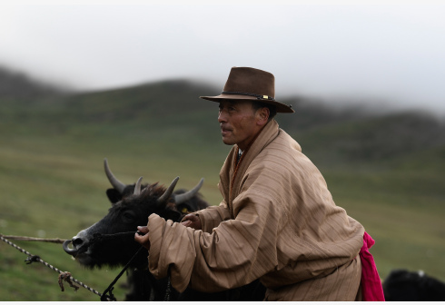 8月3日,在玛沁县当洛乡贡龙村的夏季草场上,牧民在拴牦牛。新华社记者 张龙 摄