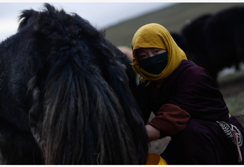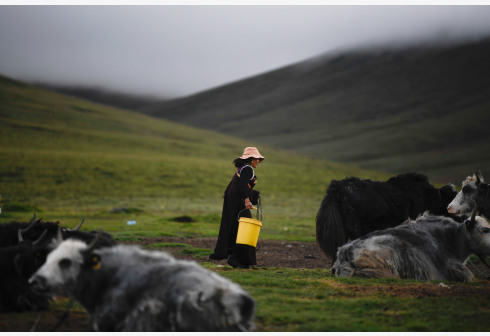 8月3日,在玛沁县当洛乡贡龙村的夏季草场上,牧民准备挤牛奶。新华社记者 张龙 摄