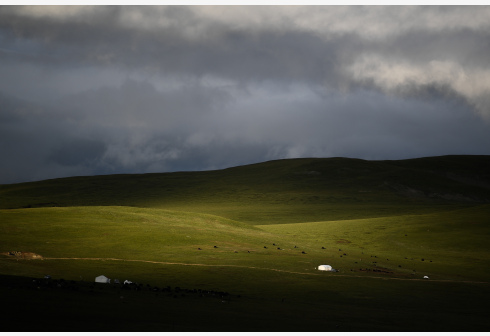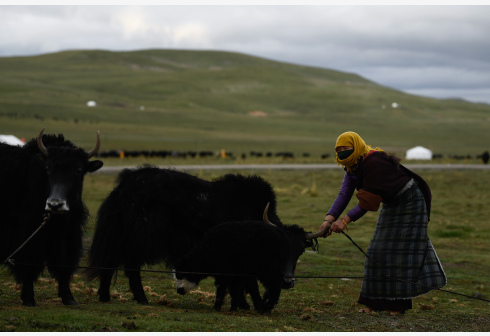 8月3日,在玛沁县当洛乡贡龙村的夏季草场上,牧民在拴牦牛。夏日时节,位于青海省果洛藏族自治州玛沁县当洛乡的草原生机勃勃,牛羊、帐篷点缀其间,牧歌回荡在高原牧场。近年来,玛沁县通过落实草畜平衡制度,大力发展生态畜牧业,采取禁牧封育、轮牧休牧等多种措施,形成生态保护和畜牧业生产的良性发展。新华社记者 张龙 摄