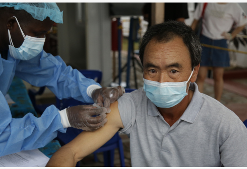 8月20日,中国公民在坦桑尼亚达累斯萨拉姆的新冠疫苗接种点接种疫苗。为海外中国公民接种新冠疫苗的“春苗行动”20日在坦桑尼亚最大城市达累斯萨拉姆启动,将为约4500名在坦中国同胞接种疫苗。 新华社 发(赫尔曼·埃马纽埃尔 摄)