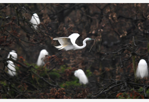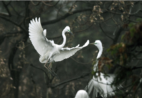 白鹭在象山森林公园内飞舞(3月10日摄)。每年3月至8月,数十万羽鹭鸟都会从东南亚等地迁徙至江西省南昌市新建区象山森林公园内繁衍生息,形成鄱阳湖畔独特的森林候鸟景观。森林面积逐年扩大,生态环境不断改善,飞来的鹭鸟越来越多,村民的护鸟意识逐渐增强,野生白鹭与人类的距离日益拉近,象山森林公园渐渐有了“鹭鸟王国”的美誉。2021年,记者在近半年的时间里跟踪拍摄了象山白鹭求偶、筑巢、孵化、哺育、教飞等栖息过程,用镜头系统记录下了这些“白色精灵”在象山栖息的“中国日记”。 新华社记者 万象 摄