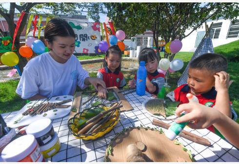8月31日,老师带领孩子们参加“野趣艺术”制作树叶画活动。当日,湖州市长兴县泗安镇二界岭中心幼儿园开展以“野趣游戏 快乐童年”为主题的乡土课程,让孩子们体验与大自然亲密接触的快乐。近年来,浙江省湖州市长兴县教育部门积极推进学校特色品牌建设,设立乡土文化特色课程,把花卉花艺、农耕种植等融入到教育教学当中。 新华社记者 徐昱 摄