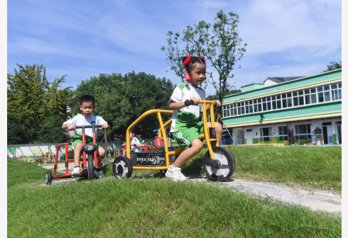 8月31日,孩子们参加“坡道骑行”趣味活动。当日,湖州市长兴县泗安镇二界岭中心幼儿园开展以“野趣游戏 快乐童年”为主题的乡土课程,让孩子们体验与大自然亲密接触的快乐。近年来,浙江省湖州市长兴县教育部门积极推进学校特色品牌建设,设立乡土文化特色课程,把花卉花艺、农耕种植等融入到教育教学当中。 新华社记者 徐昱 摄
