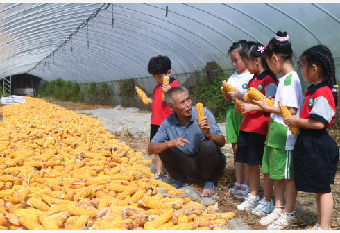 8月31日,孩子们在大棚内听农民伯伯介绍收获的农作物。当日,湖州市长兴县泗安镇二界岭中心幼儿园开展以“野趣游戏 快乐童年”为主题的乡土课程,让孩子们体验与大自然亲密接触的快乐。近年来,浙江省湖州市长兴县教育部门积极推进学校特色品牌建设,设立乡土文化特色课程,把花卉花艺、农耕种植等融入到教育教学当中。新华社记者 徐昱 摄