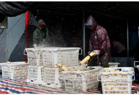 9月30日,在颍上县夏桥镇,村民在冲洗采收的莲藕。近年来,安徽省阜阳市颍上县因地制宜,引导当地农民种植芡实、莲藕等,促进农民增收,助力乡村振兴。新华社记者 黄博涵 摄