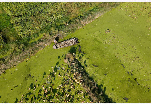 9月30日,在颍上县夏桥镇莲藕种植基地,村民在采收莲藕(无人机照片)。近年来,安徽省阜阳市颍上县因地制宜,引导当地农民种植芡实、莲藕等,促进农民增收,助力乡村振兴。 新华社记者 黄博涵 摄