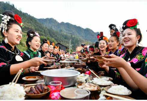 10月2日,在贵州省剑河县太拥镇昂英村,游客和村民在吃长桌宴。当日,贵州省黔东南苗族侗族自治州剑河县太拥镇昂英村举办“开鱼节”活动,村民和游客通过抓鱼比赛、跳芦笙舞、长桌宴等形式,庆祝苗寨丰收,欢度国庆假期。 新华社记者 杨文斌 摄