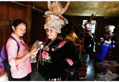 10月2日,在贵州省剑河县太拥镇昂英村,苗族女孩在参加“开鱼节”活动前盛装打扮。当日,贵州省黔东南苗族侗族自治州剑河县太拥镇昂英村举办“开鱼节”活动,村民和游客通过抓鱼比赛、跳芦笙舞、长桌宴等形式,庆祝苗寨丰收,欢度国庆假期。 新华社记者 杨文斌 摄