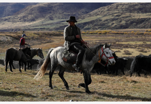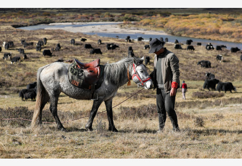 10月16日,四川省红原县阿木乡卡口村藏牧民泽仁三周在冬季转场的路上照看马匹。近日,随着天气转凉,川西北草原上的牧民们又开始了一年一度的牲畜冬季转场。当地藏牧民赶着大批牛、羊、马,从深山的夏季牧场回迁到交通方便、水草肥美的冬牧场轮牧。川西北的牧民在夏牧场放牧的时间较短,冬牧场上的时间较长,约占全年的三分之二,冬牧场也是当地牧民定居点。转场的距离近的有一二十公里,远的有上百公里,超过五十公里牧民就要用两天行走。新华社记者 江宏景 摄