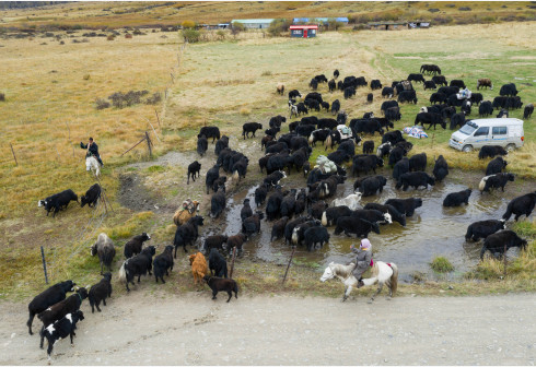 10月17日,经过两天爬涉,四川省红原县阿木乡卡口村藏牧民顿炯和向巴两家的牛羊回到冬牧场的草场上(无人机照片)。近日,随着天气转凉,川西北草原上的牧民们又开始了一年一度的牲畜冬季转场。当地藏牧民赶着大批牛、羊、马,从深山的夏季牧场回迁到交通方便、水草肥美的冬牧场轮牧。川西北的牧民在夏牧场放牧的时间较短,冬牧场上的时间较长,约占全年的三分之二,冬牧场也是当地牧民定居点。转场的距离近的有一二十公里,远的有上百公里,超过五十公里牧民就要用两天行走。 新华社记者 江宏景 摄