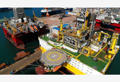 10月18日拍摄的“蓝鲸1号”平台(无人机照片)。近期,曾经在我国南海成功试采可燃冰的大型海工装备“蓝鲸1号”及姊妹平台“蓝鲸2号”正在其生产地——中集来福士海洋工程有限公司烟台基地进行维护和保养。据了解,2017年2月交付的“蓝鲸1号”最大作业水深3658米,适用于全球深海作业。新华社记者 李紫恒 摄