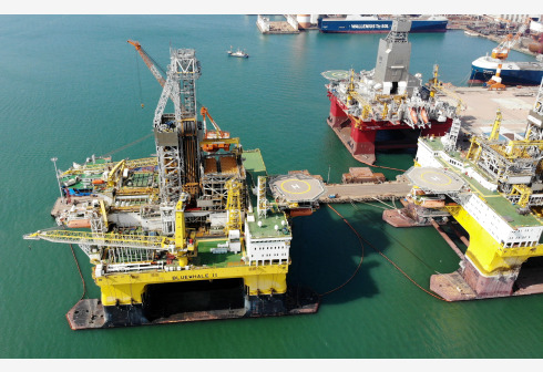 “蓝鲸1号”(前右)及姊妹平台“蓝鲸2号”正在其生产基地中集来福士海洋工程有限公司烟台基地进行维护和保养(10月18日摄,无人机照片)。新华社记者 李紫恒 摄