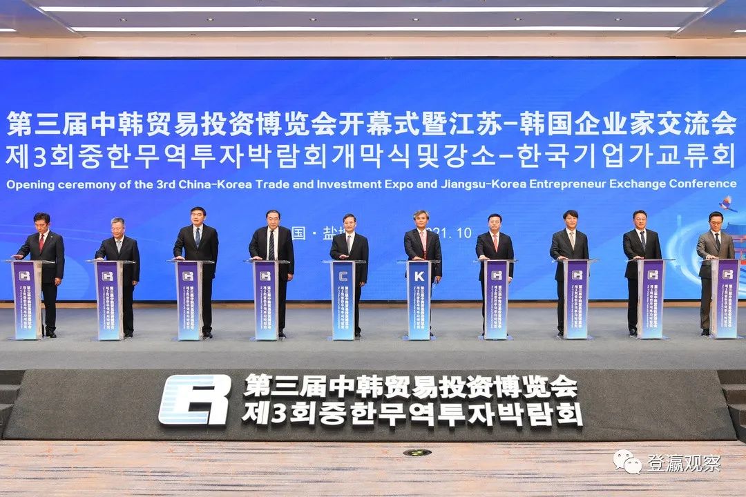 今年是“中韩文化交流年”启动之年,10月29日,第三届中韩贸易投资博览会暨江苏—韩国企业家交流会在盐城国际会展中心开幕。副省长惠建林、韩国驻上海总领事馆总领事金胜镐、中国国际贸易促进委员会副会长张少刚、商务部驻宁办特派员王选庆、韩国产业通商资源部通商协力局局长KaramSeo、韩国新万金开发厅厅长梁忠模分别致辞。市委书记、市人大常委会党组书记曹路宝致辞并推介中韩(盐城)产业园。韩国驻华大使馆经济公使刘福根、省政府副秘书长黄澜、省商务厅厅长陈涛、省外事办一级巡视员黄锡强等出席。市委副书记、代市长周斌主持,市政协主席陈红红出席。