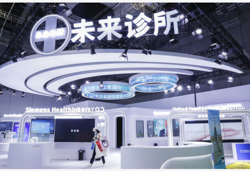 11月6日,一名参观者走过公共卫生防疫专区的未来诊所展台。第四届进博会医疗器械及医药保健展区延续了上一届的公共卫生防疫专区,展示了更多抗疫新动态、新成果,应对公共卫生新挑战。新华社记者 张玉薇 摄