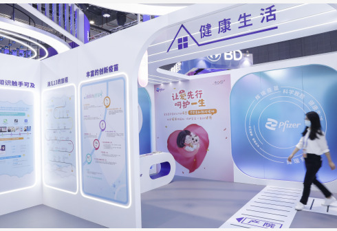 11月6日,工作人员走过公共卫生防疫专区的辉瑞疫苗展台。第四届进博会医疗器械及医药保健展区延续了上一届的公共卫生防疫专区,展示了更多抗疫新动态、新成果,应对公共卫生新挑战。 新华社记者 张玉薇 摄