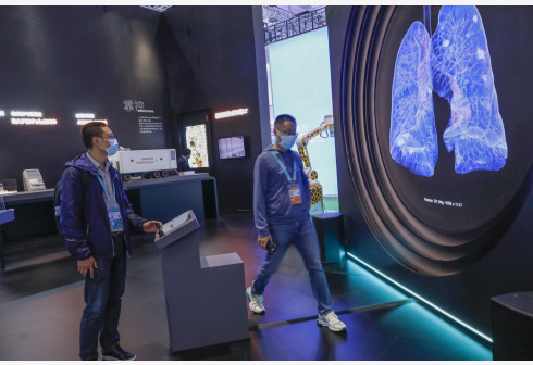 11月6日,观众在公共卫生防疫专区的西门子医疗展台体验实影渲染技术“重塑”肺部感染动态影像互动装置。第四届进博会医疗器械及医药保健展区延续了上一届的公共卫生防疫专区,展示了更多抗疫新动态、新成果,应对公共卫生新挑战。新华社记者 张玉薇 摄