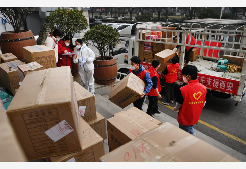 1月6日,西安市新城区青年志愿者在搬运各地捐献的抗疫物资。连日来,来自全国多地的防疫力量和生活物资源源不断汇集西安,支援西安抗击疫情。 新华社记者 陶明 摄