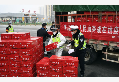 1月6日,西安市志愿者在高速未央北站出口搬运来自延安市洛川县的慰问品。连日来,来自全国多地的防疫力量和生活物资源源不断汇集西安,支援西安抗击疫情。 新华社记者 陶明 摄