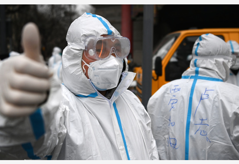 1月6日,防疫人员在为一家隔离酒店铺设防护膜时为西安加油。连日来,来自全国多地的防疫力量和生活物资源源不断汇集西安,支援西安抗击疫情。新华社记者 陶明 摄