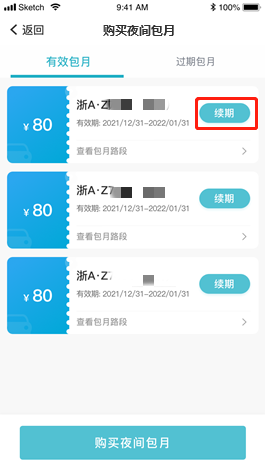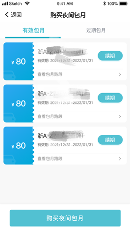 第六步:包月续期 点击包月车的“续期”按钮→进入“道路夜间包月订单页面”→选择开始日期→提交订单并支付包月费用,即可完成续期。(注:续费不可选择车车牌,开始日期不能和原来包月日期重复)
