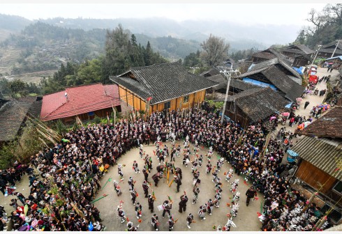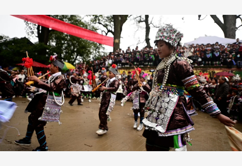 1月21日,石雪琴加入的芦笙队在跳芦笙舞。石雪琴(苗名“更新”)是贵州省黔东南苗族侗族自治州从江县丙妹镇大塘村的一名苗族女孩。现在12岁的她,就读于大塘小学六年级。为庆祝苗寨传统的芦笙节、喜迎即将到来的新春佳节,大塘村的村民自发组织和举办了盛大的芦笙会。芦笙会当天,石雪琴早早起床,在母亲的帮助下穿上盛装、戴上银饰,邀约小伙伴前往芦笙场一起参加芦笙会。 新华社记者 杨文斌 摄