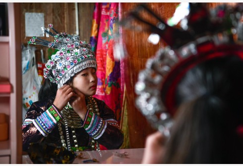 石雪琴(苗名“更新”)是贵州省黔东南苗族侗族自治州从江县丙妹镇大塘村的一名苗族女孩。现在12岁的她,就读于大塘小学六年级。为庆祝苗寨传统的芦笙节、喜迎即将到来的新春佳节,大塘村的村民自发组织和举办了盛大的芦笙会。芦笙会当天,石雪琴早早起床,在母亲的帮助下穿上盛装、戴上银饰,邀约小伙伴前往芦笙场一起参加芦笙会。 新华社记者 杨文斌 摄