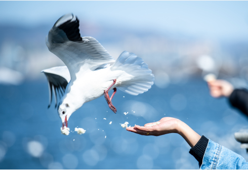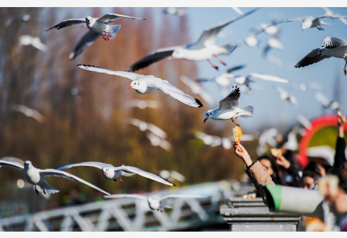 1月23日,一只红嘴鸥从游人手中取食。当日,云南省昆明市阳光明媚,滇池海埂大坝游人如织,人鸥同乐成为昆明的一道风景线。新华社记者 王冠森 摄