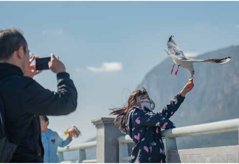 1月23日,游人在昆明市滇池海埂大坝上观赏、投喂红嘴鸥。当日,云南省昆明市阳光明媚,滇池海埂大坝游人如织,人鸥同乐成为昆明的一道风景线。新华社记者 王冠森 摄