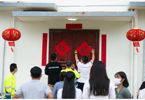 1月22日,在老挝琅勃拉邦,中老铁路琅勃拉邦维保管理中心员工在驻地贴福字。为保障春节期间中老铁路正常运行,执行中老铁路老挝段固定设备维保任务的中国铁路昆明局集团有限公司琅勃拉邦维保管理中心中老员工22日在驻地布置新年装饰、吃“年夜饭”,提前过年。新华社 发(凯乔 摄)