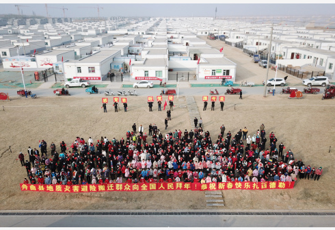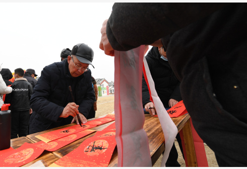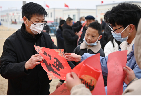 1月25日,在兰州新区舟曲避险搬迁安置点,舟曲地质灾害避险搬迁第一临时党支部组织书法家给搬迁群众送春联。虎年春节将至,甘肃省兰州新区的舟曲县避险搬迁群众将迎来搬迁后的首个春节。从大山深处来到兰州新区,避险搬迁让他们摆脱了连年受灾的苦恼,在新家开启幸福新生活。甘肃省甘南藏族自治州舟曲县是滑坡、泥石流、崩塌等地质灾害高发区,2021年甘肃省启动舟曲县地质灾害避险搬迁工程,将灾害多发区的群众,搬迁到千里之外的兰州新区。截至目前,已有3000多名舟曲避险搬迁群众在兰州新区安居乐业。 新华社记者 范培珅 摄