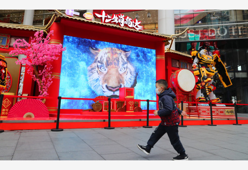 1月28日,小朋友从上海南京东路上一个虎年主题展示台前走过。近日来,上海街头充满喜庆迎新气氛,迎接即将到来的虎年春节。 新华社记者 方喆摄