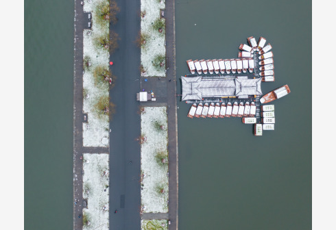 被白雪覆盖的西湖白堤(1月29日摄,无人机照片)。当日,冬日的杭州西湖被白雪覆盖,构成一幅银装素裹的“雪西湖”美景。 新华社记者 徐昱 摄