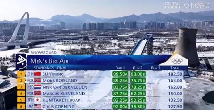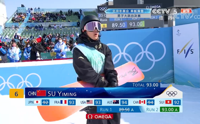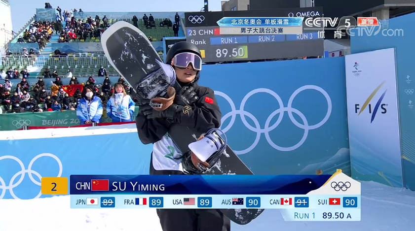 最后,苏翊鸣得到89.50分,暂排第二,落后第一名美国选手克里斯·科宁2.5分。