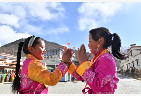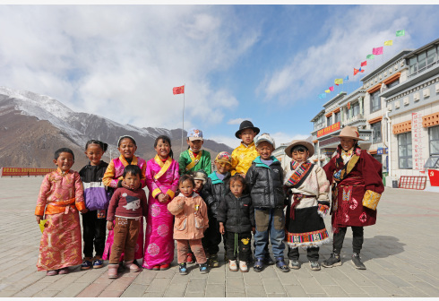 部分搬迁牧民家的孩子在搬迁点广场上合影,他们当中大一点的出生在荣玛,最小的几个出生在古荣(2月28日摄)。时近藏历新年,在拉萨市堆龙德庆区古荣镇荣玛高海拔生态搬迁点,搬迁牧民们采办年货、载歌载舞,喜迎佳节。荣玛高海拔生态搬迁点是西藏首个高海拔生态搬迁项目。为改善那曲市尼玛县荣玛乡群众生活条件,同时为羌塘国家级自然保护区内野生动物提供更多生存空间,2018年6月,政府组织千余名牧民离开平均海拔5000米的家乡,搬迁至拉萨市堆龙德庆区古荣镇荣玛高海拔生态搬迁点。266栋白墙红顶的二层楼房成为他们的新家。海拔低了,生活也好了。2021年,荣玛高海拔生态搬迁点1268人人均收入达到19000多元。新华社记者 姜帆 摄