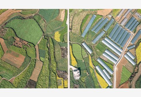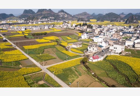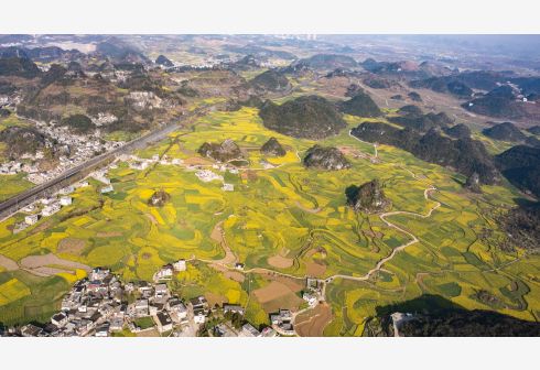 贵州省六盘水市六枝特区木岗镇的油菜花田(3月3日摄,无人机照片)。近日,贵州省六盘水市六枝特区木岗镇的万余亩油菜花竞相绽放,与田地、民居、道路构成了美丽的春日画卷。 新华社记者 陶亮 摄