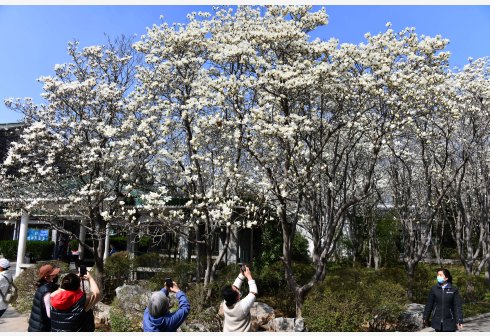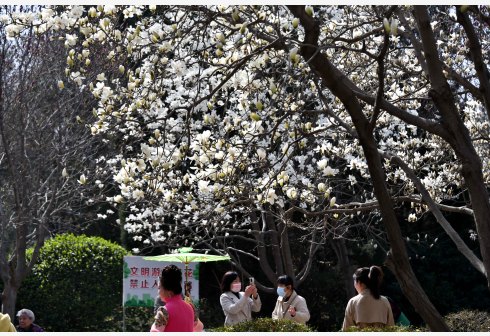 3月14日,游客在山东省济南市百花公园拍摄盛开的玉兰花。随着气温上升,泉城济南市区内各处玉兰花大面积盛开,美不胜收。 新华社记者 徐速绘 摄
