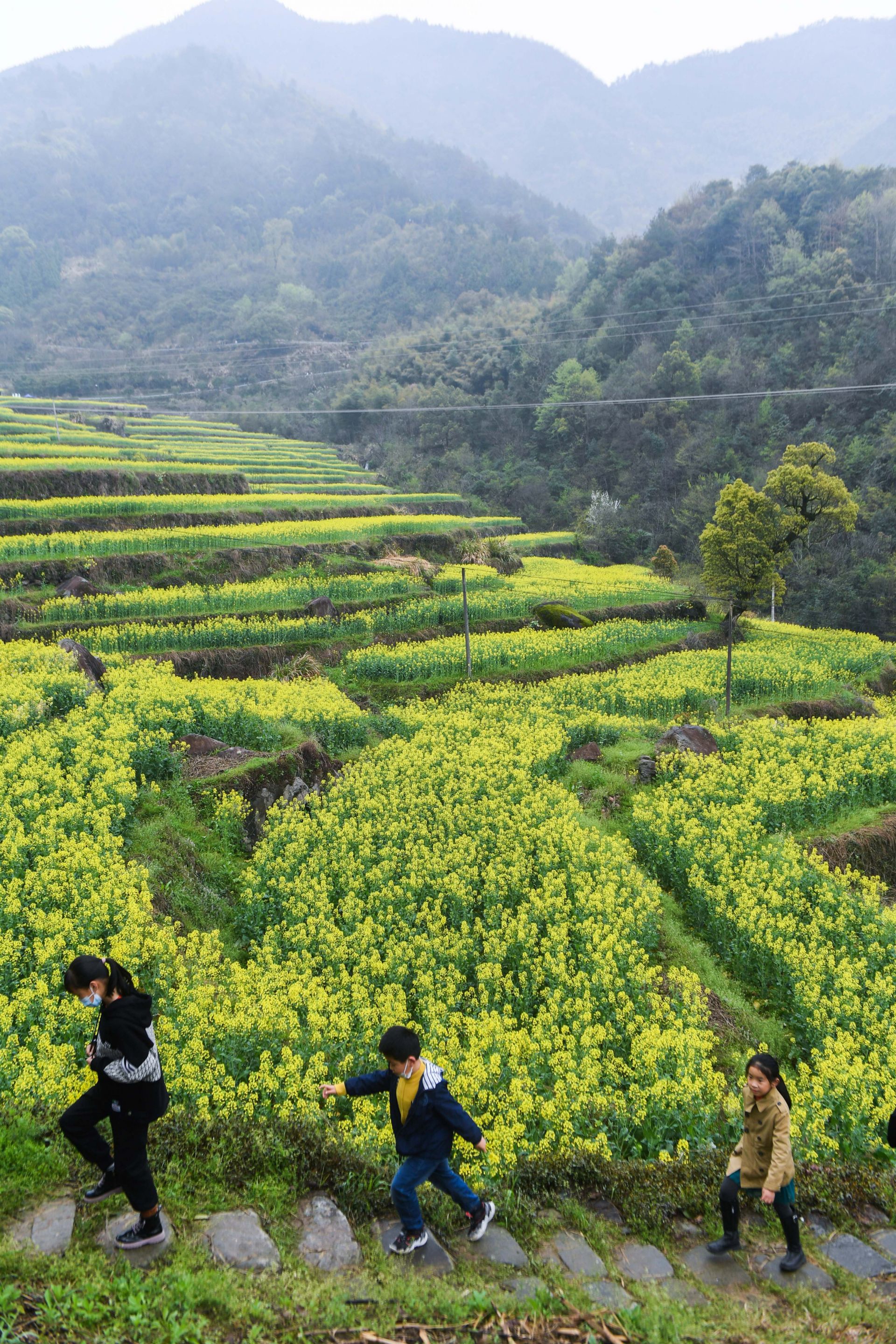 3月27日,游客在胥岭村的古道上感受山乡春日。当日,浙江省建德市乾潭镇胥岭村开启首届“花朝节”,市民和游客在胥岭村观赏油菜花,体验胥岭古道和“花朝市集”。乾潭镇胥岭村是典型的江南山乡古村落,这里的400多亩梯田种满油菜花。本次春季花朝节展现了传统农耕文化魅力,利用农文旅交融促进全域旅游发展、助力共同富裕。新华社记者 徐昱 摄