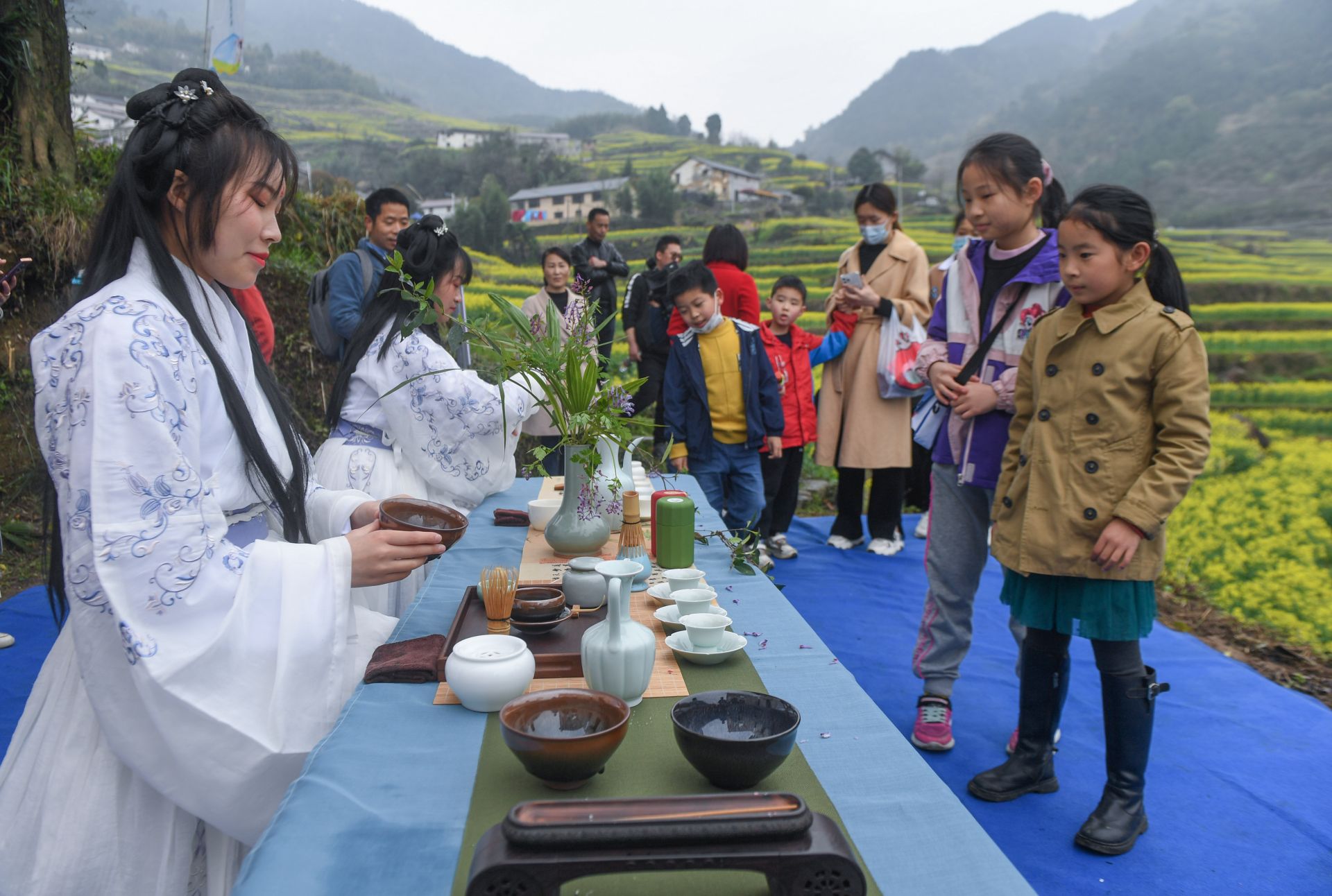 3月27日,胥岭村“花朝节”上进行茶艺表演。当日,浙江省建德市乾潭镇胥岭村开启首届“花朝节”,市民和游客在胥岭村观赏油菜花,体验胥岭古道和“花朝市集”。乾潭镇胥岭村是典型的江南山乡古村落,这里的400多亩梯田种满油菜花。本次春季花朝节展现了传统农耕文化魅力,利用农文旅交融促进全域旅游发展、助力共同富裕。新华社记者 徐昱 摄