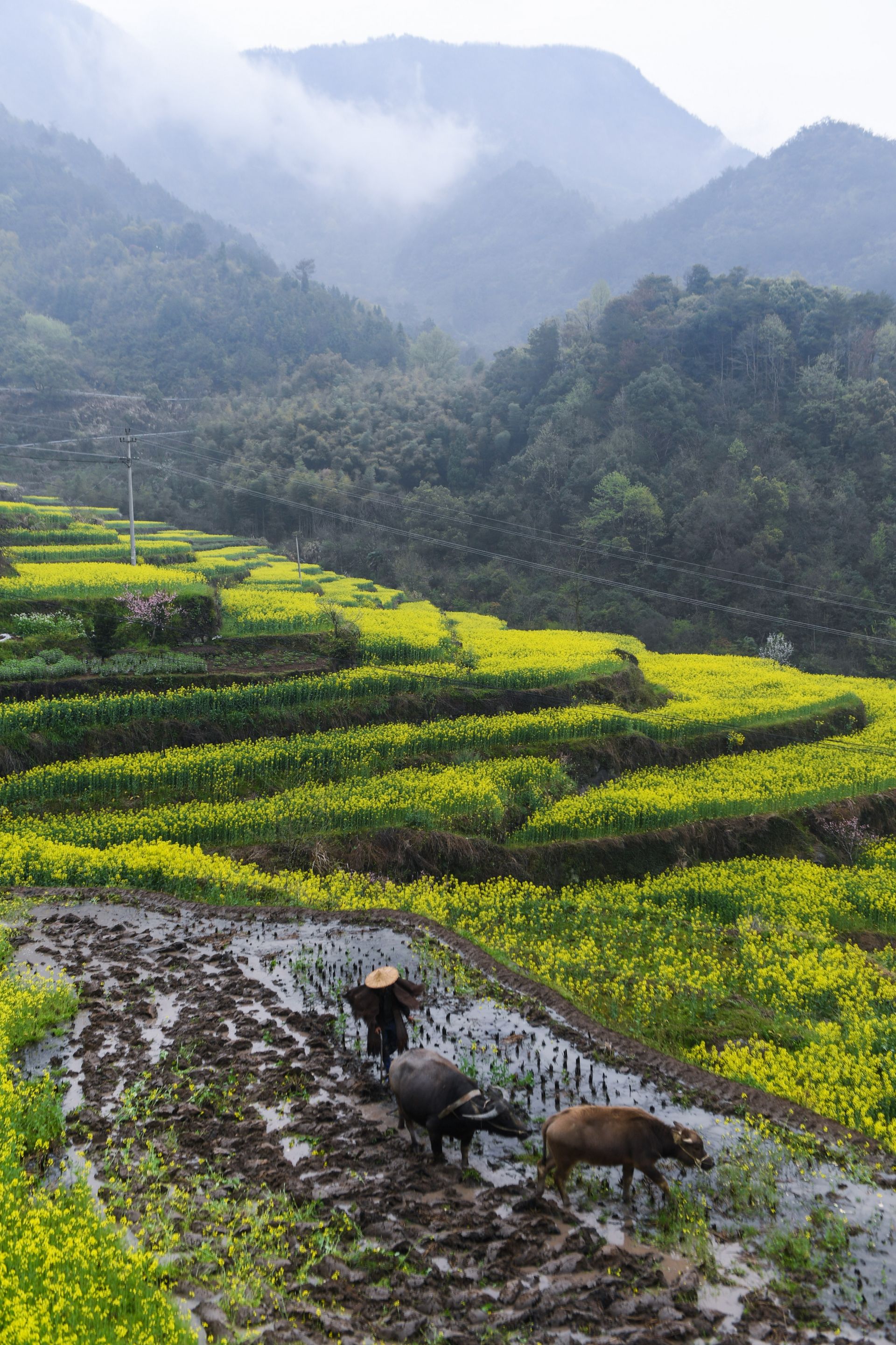 3月27日,胥岭村的村民在梯田上犁地。当日,浙江省建德市乾潭镇胥岭村开启首届“花朝节”,市民和游客在胥岭村观赏油菜花,体验胥岭古道和“花朝市集”。乾潭镇胥岭村是典型的江南山乡古村落,这里的400多亩梯田种满油菜花。本次春季花朝节展现了传统农耕文化魅力,利用农文旅交融促进全域旅游发展、助力共同富裕。新华社记者 徐昱 摄