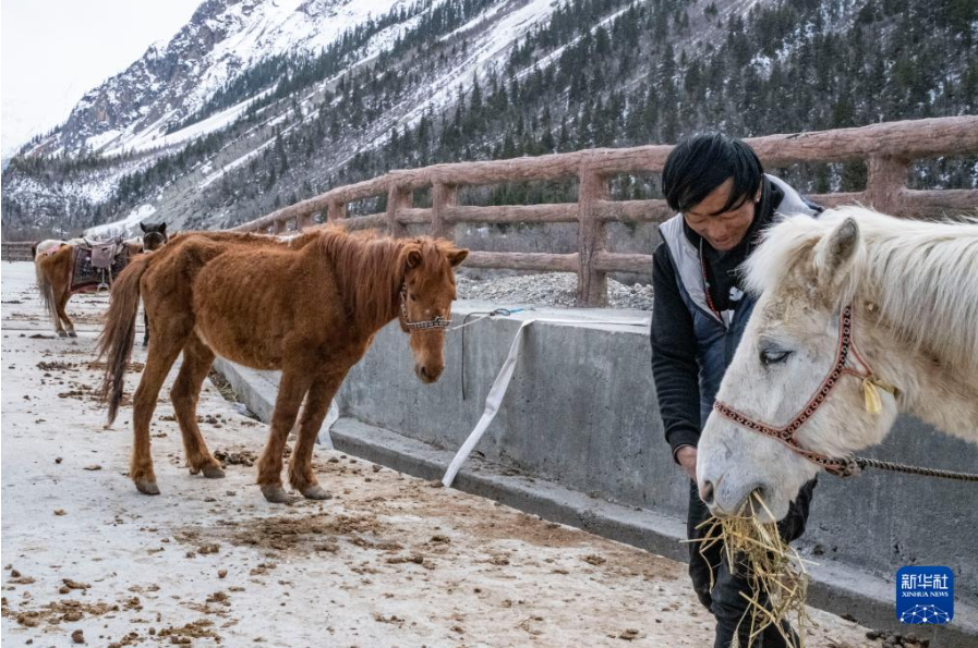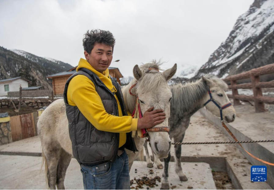 村民在林芝市波密县境内的米堆冰川脚下喂马(4月23日摄)。新华社记者 孙非 摄